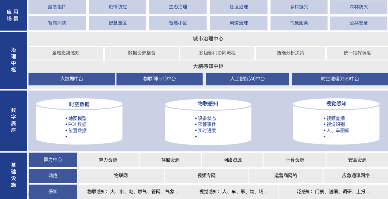 在城市数字底座之上延伸出各式各样便民、利民的场景应用,例如应急指挥、疫情防控、生态治理、智慧消防、智慧小区、河道治理、气象服务等等,赋能基层治理与社会民生。