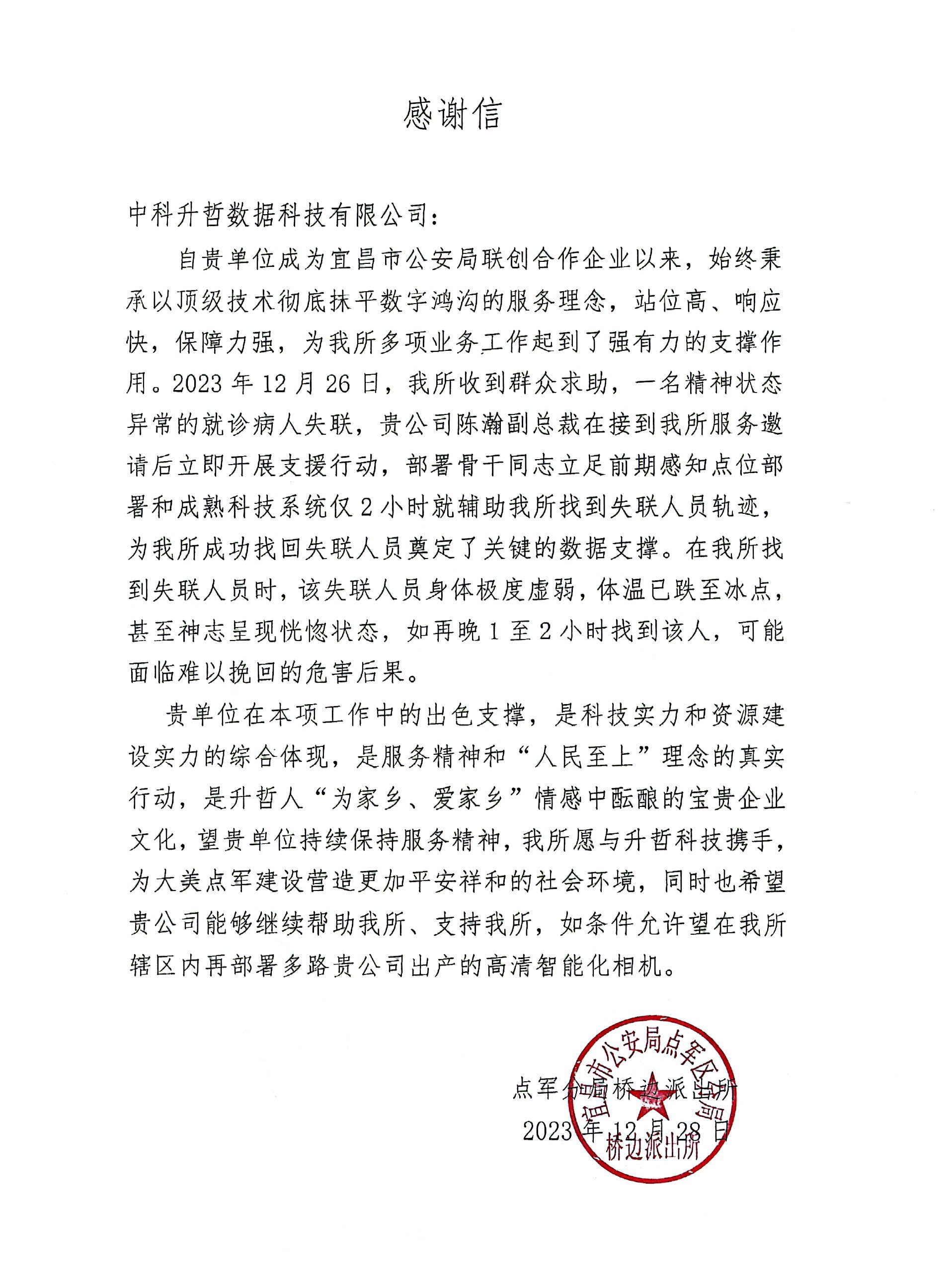 12 月 28 日,宜昌市公安局点军分局桥边派出所向中科升哲发来一封感谢信,表示中科升哲于本月 26 日及时响应,辅助警方在 2 小时内找到失联就医人员,为及时挽救生命的技术支持能力表示由衷感谢。
